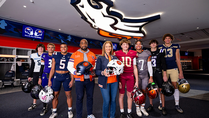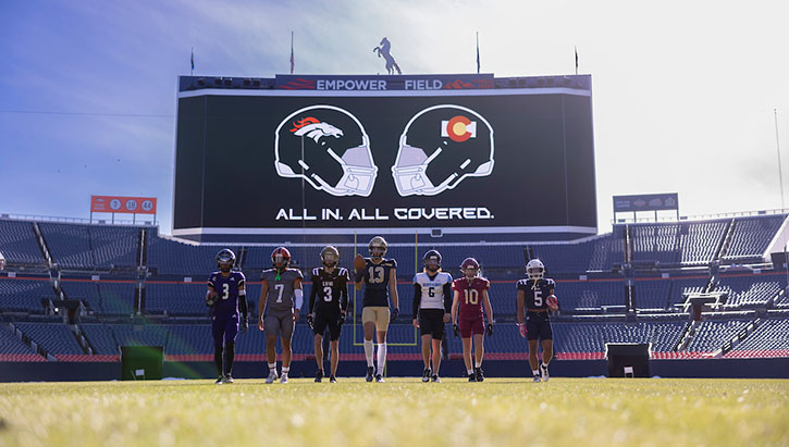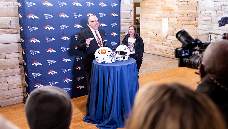 News: The single largest philanthropic investment in Broncos history, ALL IN. ALL COVERED. will supply high schools statewide—from 6-man to 5A classifications—with the highly-rated Riddell helmet.